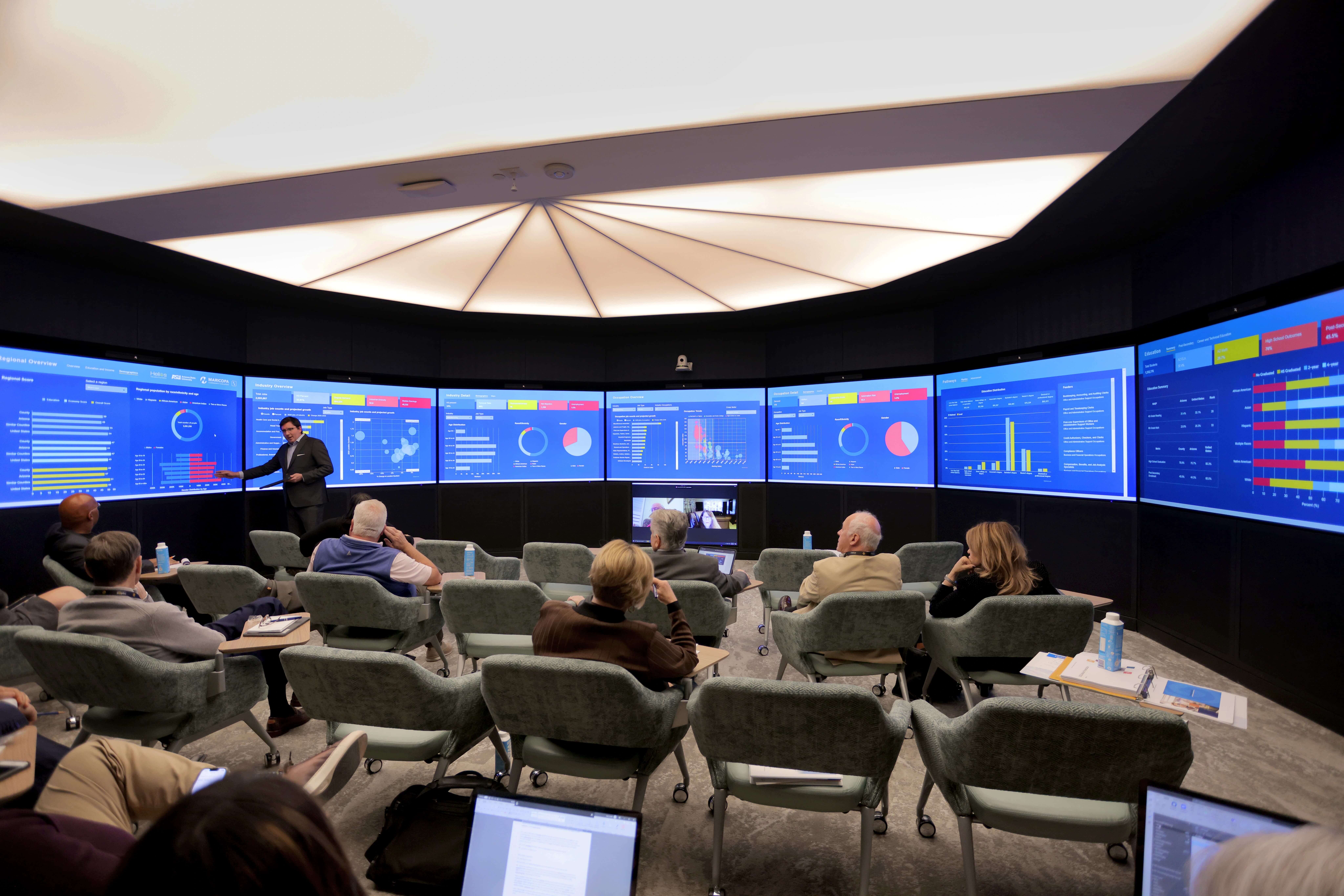 The Campus is also home to the Helios Decision Theater, part of the ASU Helios Decision Center for Educational Excellence (ASU Helios Decision Center). The ASU Helios Decision Center enables key stakeholders to use data to examine the current education system and visualize the impact of potential new policies and innovative solutions for education outcomes.