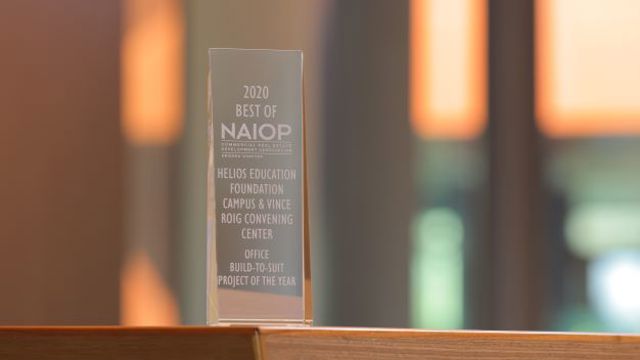 The Helios Education Campus and Vince Roig Convening Center won the Office Build-to-Suit Project of the Year Award in 2020, awarded by NAIOP Arizona. This award honors the most successful and innovative commercial development projects in Arizona. The competition is judged by real estate industry professionals based on creative design, innovative features and overcoming planning and design challenges.