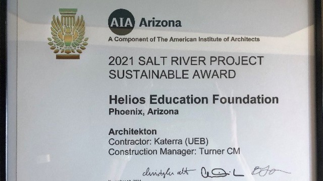 The Helios Education Campus won the SRP Sponsored Sustainable Architecture Award for 2021, given for sustainable innovation in projects that advance a post-carbon world through environmental balance and healthy spaces, along with energy, water, materials and construction conservation. The award was given by AIA Arizona, the state chapter of the American Institute of Architects.